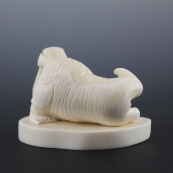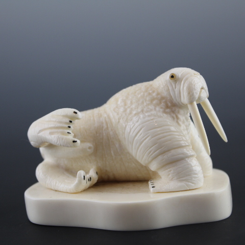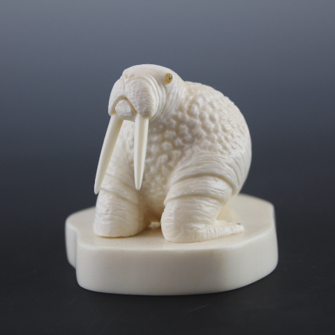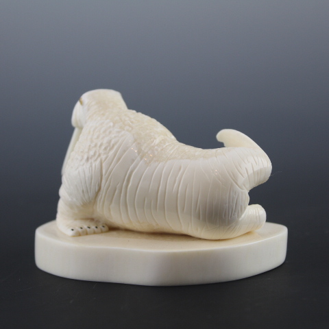 Lifelike bull walrus on tusk cross section base.