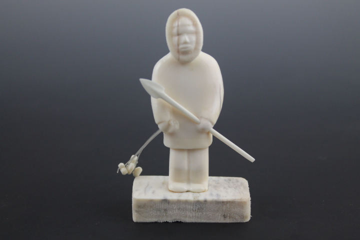 Hunter in parka stands ready with harpoon and bola.