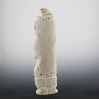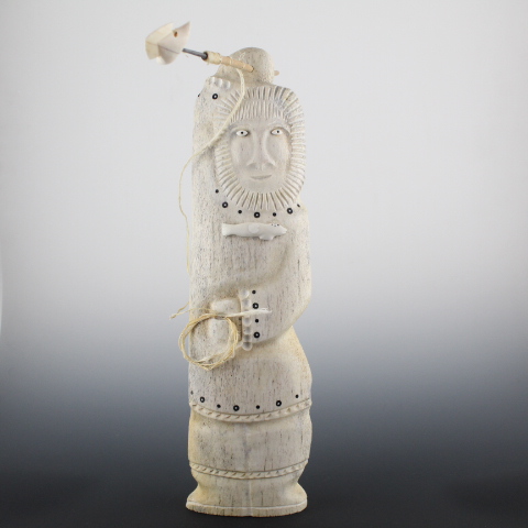 Intricate inlayed whalebone hunter with seal amulet and large harpoon.