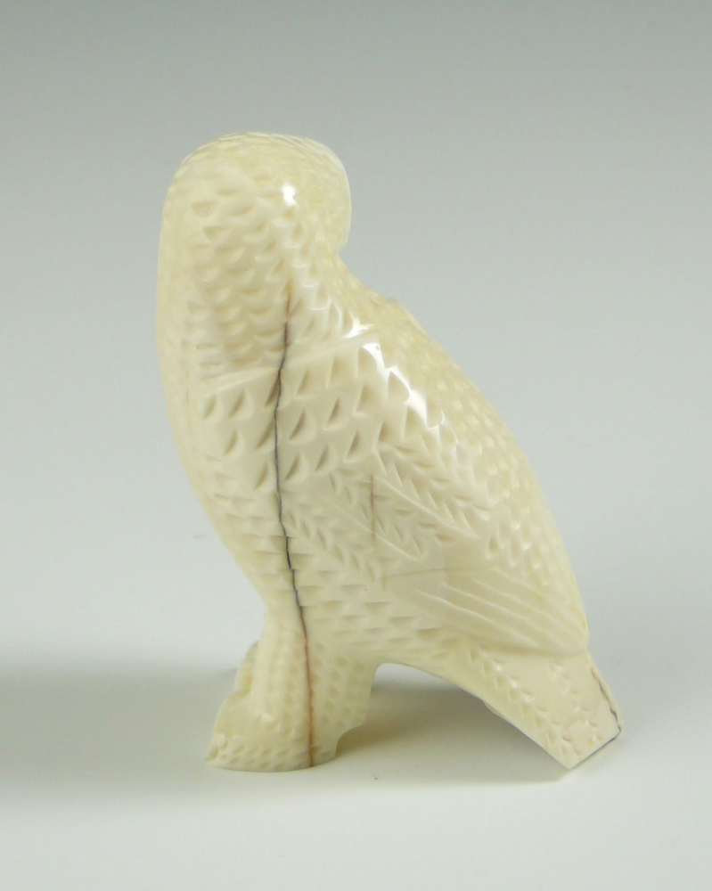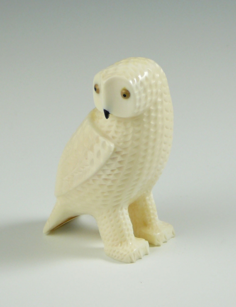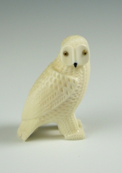 Akeya's traditional, stoic owl carving is fashioned from walrus ivory with mammoth ivory eyes and baleen inlay pupils and beak.