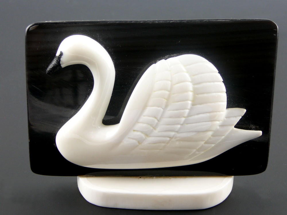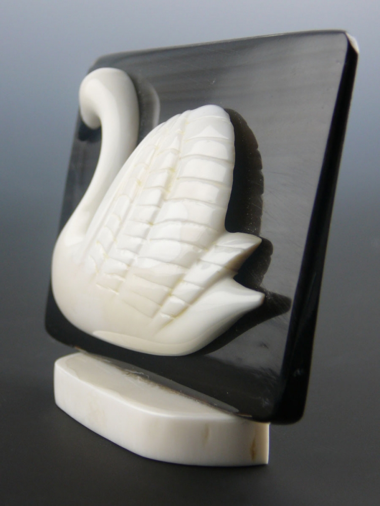 By carving the swan from walrus ivory and placing it on a baleen background, Kokuluk captures the grace of the animal's silhouette.