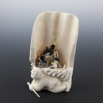 Root section of ivory with relief carving on outer surface and birds in core.