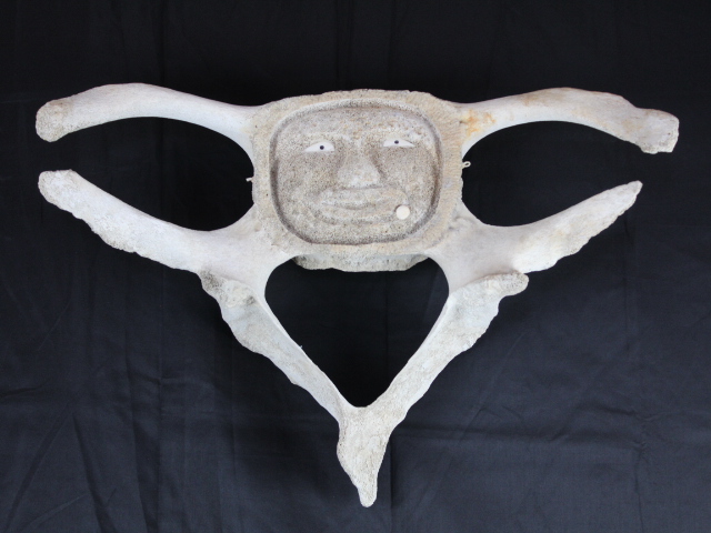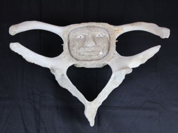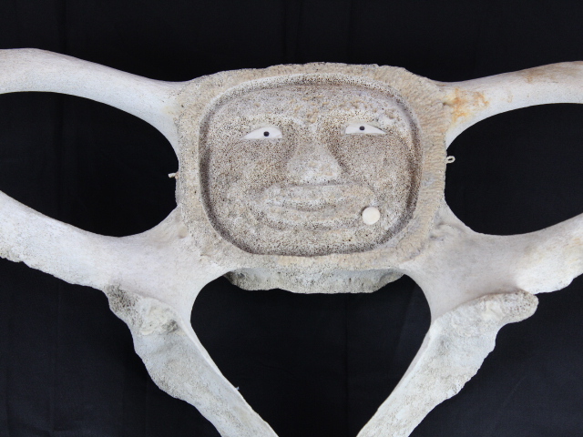 Man with ivory labrae and eyes carved into pelvic bone.