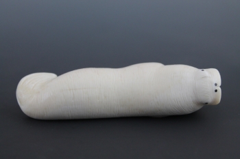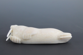 Recumbenbt walrus lays on side in finely carved detail.