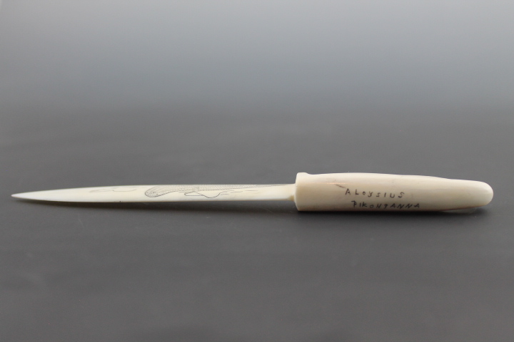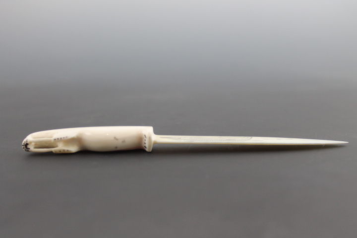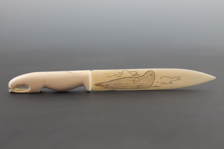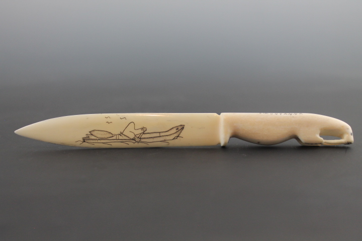 Signed letter opener with scrimshaw depicting hunter in kayak and subsistence food sea mammals.