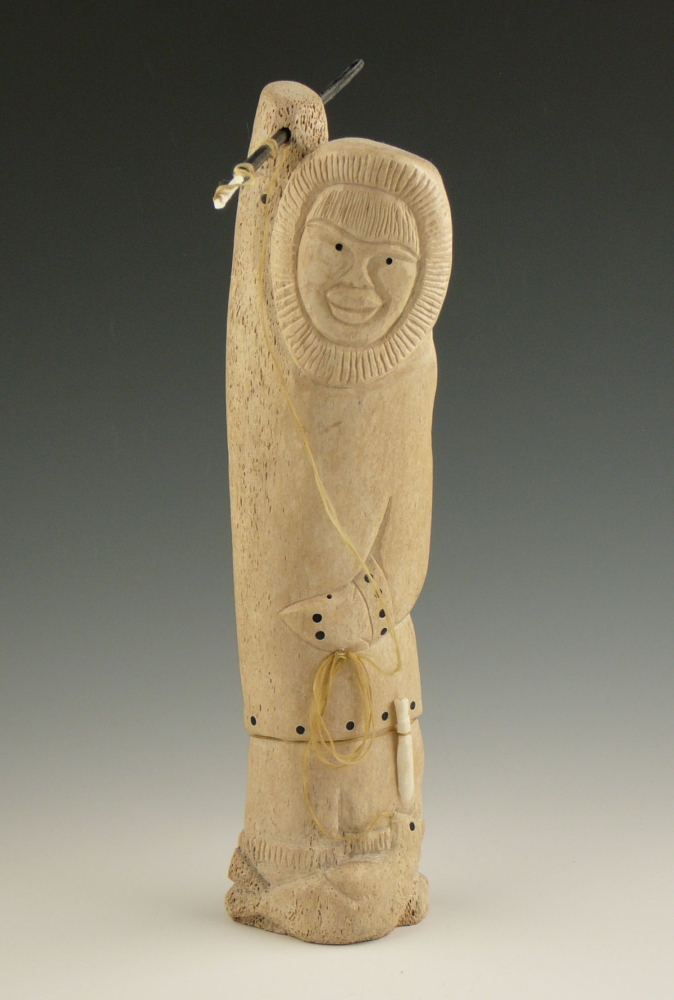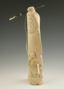 Nayokpuk has carved a hunter standing in triumph over his quarry. The traditional harpoons have ropes of sinew attached to the head in order to hook the seal and pull it back before it sinks. A caught seal lies at the hunter's feet, but supplies a base not only literally, but metaphorically. It is the base of the sculpture, but the seal is also recognized as a base of the subsistence hunt and the native way of life. The piece is carved from a whalebone with baleen inlay. The small knife at his side is walrus ivory.