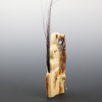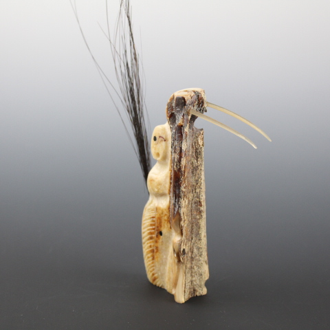 Multi-transformational piece incorporates whale shaman and walrus symbols. Made out of ancient dogsled ivory sledrunner.