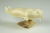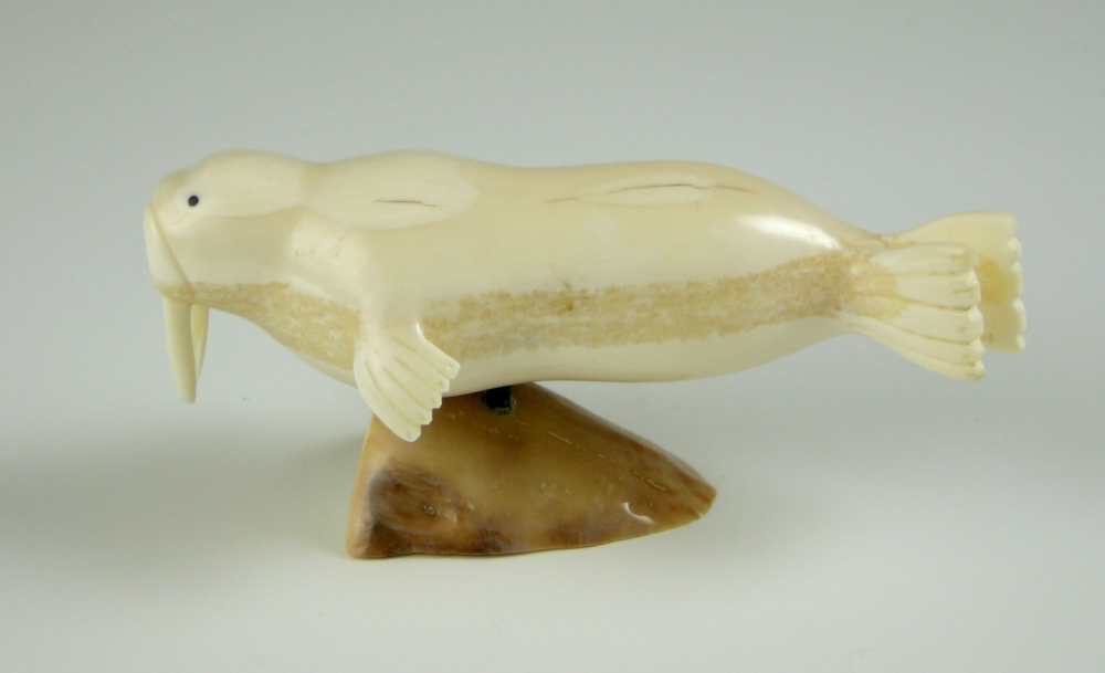 The darker core of the tusk is particularly prominent in this carving by Iya, creating a lovely dark strip down the length of the walrus' body. It is shown swimming, poised on a fossil walrus ivory base.