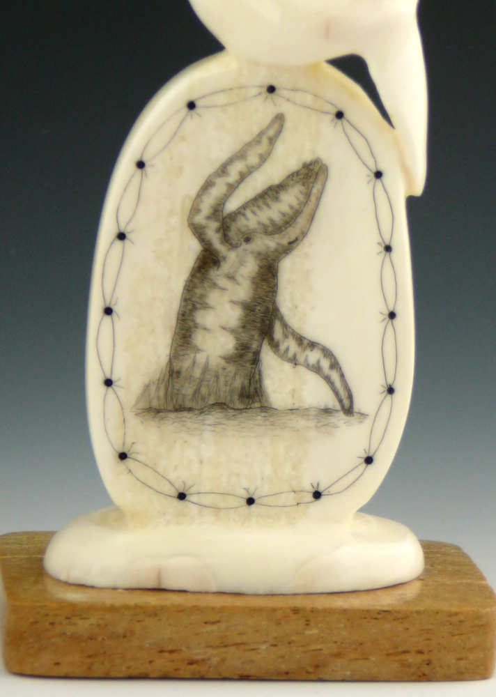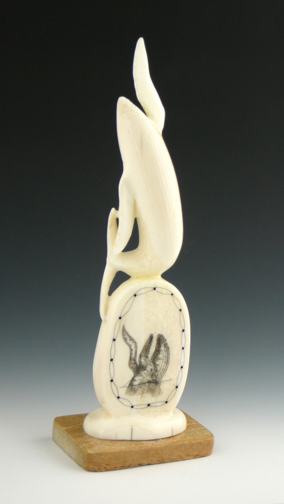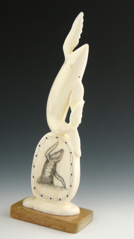 In this beautiful swimming scene, Kingeekuk incorporates a scrimshaw base. Scrimshaw is a technique wherein the artist finely incises a design in ivory and colors it in with ink. Here Kingeekuk applies his skill at precise detail both in the intricate carving of the whale and in the delicate design of the scrimshaw vignette.