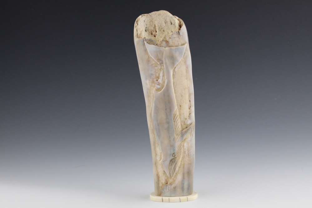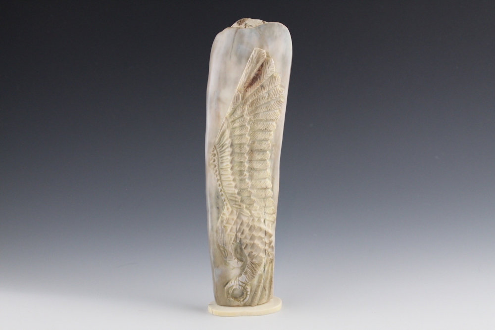 Relief carvings of eagle opposite bowhead whale in pinkish grey ivory.