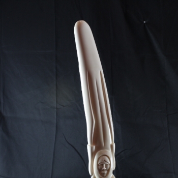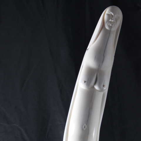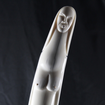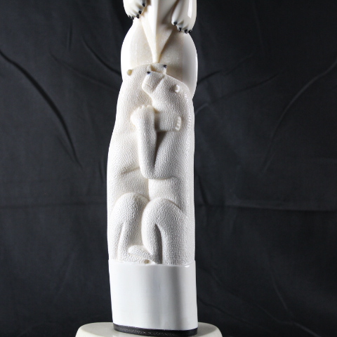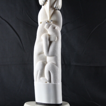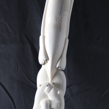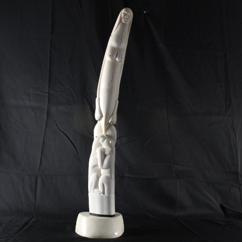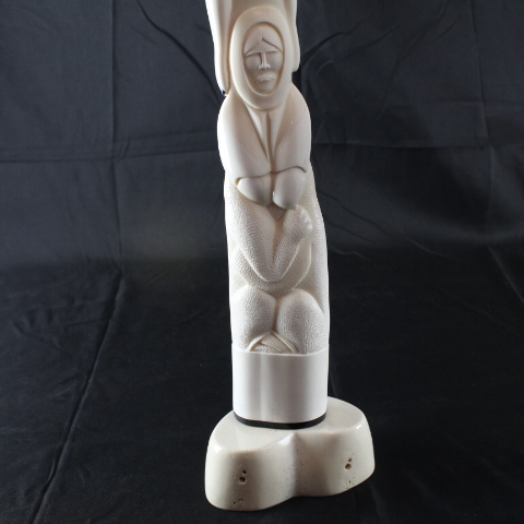 In this intricate masterpiece by Noongwook, the artist explores the power and spirituality of women and the enduring connectivity between humans and nature. The woman in the center is given polar bear claws to show her strength. She presses her lips into a whistle to call the whale. The whistle, the claws, and the whale form mask above her head emphasize her multifaceted relationship to the animals. On one side of the base, two polar bears are locked in a warm embrace showing that there is love and tenderness in addition to strength. Behind the polar bears sits the unassuming, peaceful form of an ordinary female figure because each and every woman holds within herself this awe-inspiring complexity.